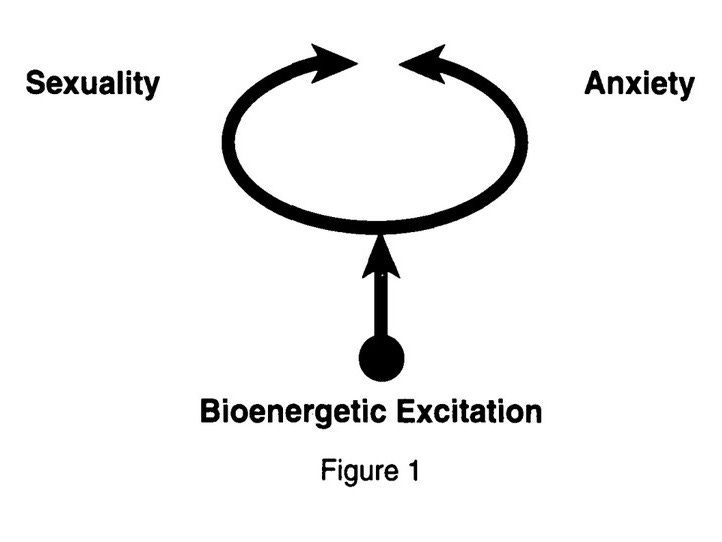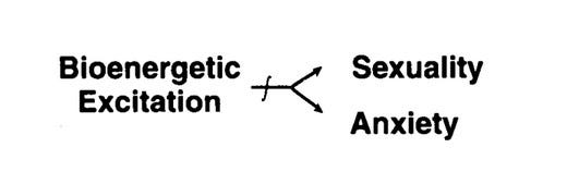 With this natural scientific tradition as his foundation, Reich profoundly influenced scientific understanding by identifying a principle which is the cornerstone of orgonomic functionalism: Two opposing or antithetical functions simultaneously are identical in terms of a common functioning principle. This understanding emerged from Reich's investigation of a number of natural functions. One of the first functions studied was the antithesis between sexuality and anxiety in his patients. He came to real ize that while they oppose each other in terms of the experience of the patient, at their basis, they are both states of bioenergetic excitation. They are differentiated by the direction of energy flow: out toward the world in sexuality and away from the world, into oneself, in anxiety (5:13-15, 6:237). Reich subsequently developed the familiar symbol of orgonomic functionalism to illustrate this basic principle (Figure 1) (7:162, 8:96).