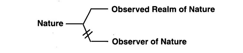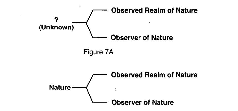 Problems such as the one described by Heisenberg illustrate the importance of understanding this relationship. In Figure 7A, we see an "observed realm of nature" paired with an "observer of nature" having an unknown common functioning principle (CFP). On reflection, it becomes apparent that the unknown CFP is "nature" (Figure 7B) (7:170, 8:110).