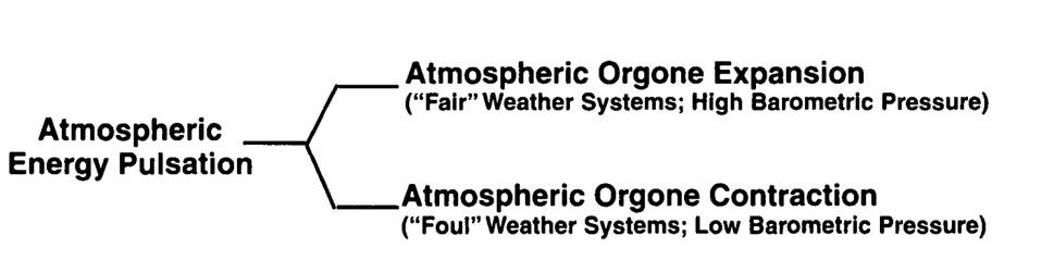 "Fair" weather is subjectively experienced as expansive, and "foul" weather as contractive. These subjective impressions of the state of the atmospheric orgone have been objectified by thermal and electroscopic measurement (12, 13). The theory that weather formations occur as a consequence of pulsations in the planetary orgone energy streams makes observations of the weather all the more exciting because it connects our own individual emotional pulsation with the larger objective reality of atmospheric energy pulsations.